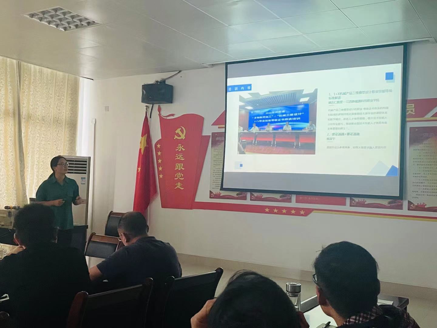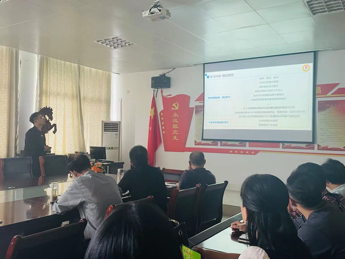 孙栋梁老师对参加的传感网培训进行汇报总结,介绍了STM32以及无线通讯的相关实训项目。随后赵琨老师和张亚平老师分别就国培新能源汽修和三维模型设计的学习内容进行了分享。